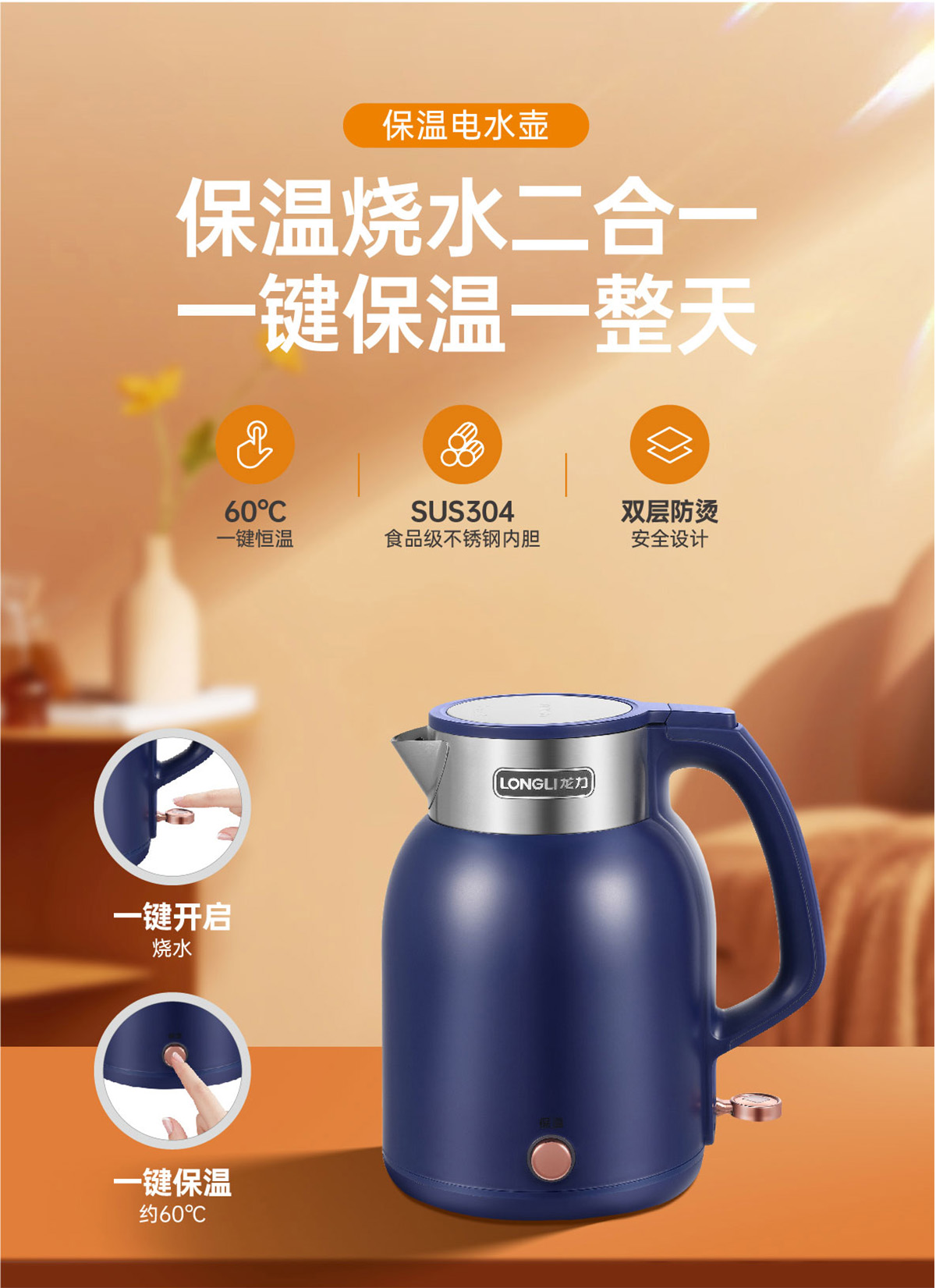如果您覺得使用飲水機(jī)清理比較麻煩,不如試一試龍力8836電水壺吧!雙層防燙安全設(shè)計(jì),外層采用高品質(zhì)耐高溫塑料,隔熱不燙手;食品級(jí)304不銹鋼內(nèi)膽,每一口都是放心水,無(wú)縫內(nèi)壁不易藏污納垢;使用進(jìn)口溫控器,24小時(shí)長(zhǎng)效保溫,喝水無(wú)需反復(fù)燒煮。